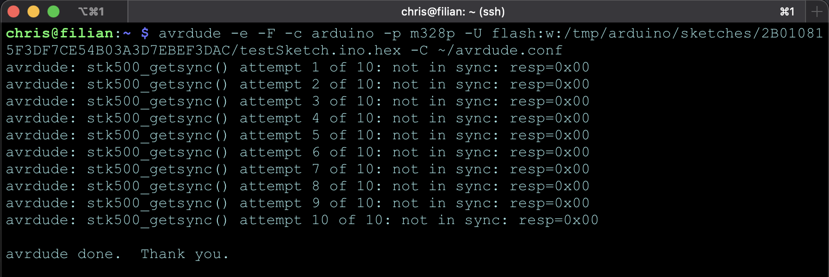 This failure is expected. For the Arduino's boot loader to accept an upload, it must be physically reset. You can hold down the Arduino’s reset button, submit the command in the terminal and immediately release the reset button to achieve this manually.