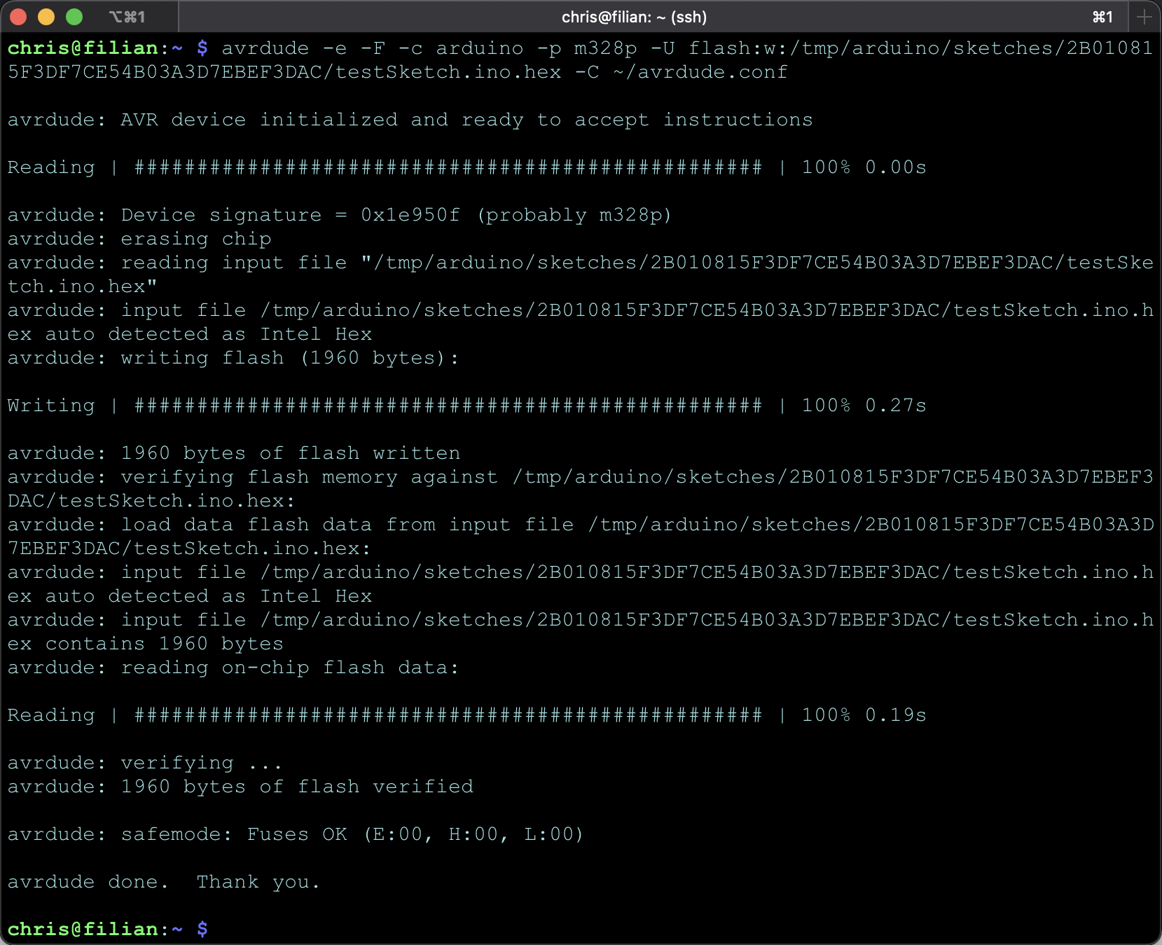 avrdude -c arduino -p m328p -U flash:w:(YOUR_PATH_HERE)/testSketch.ino.hex -C ~/avrdude.conf -P /dev/ttyACM0