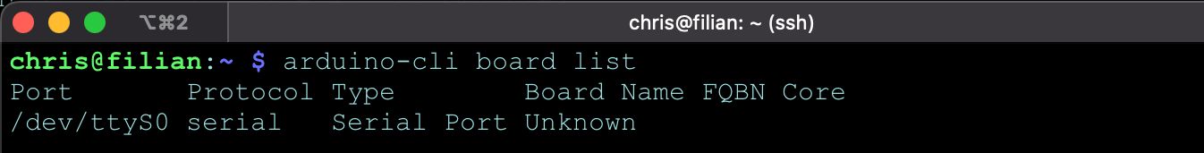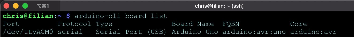 Once connected by USB or GPIO, run the board list command to determine if the RPi can detect your Arduino.