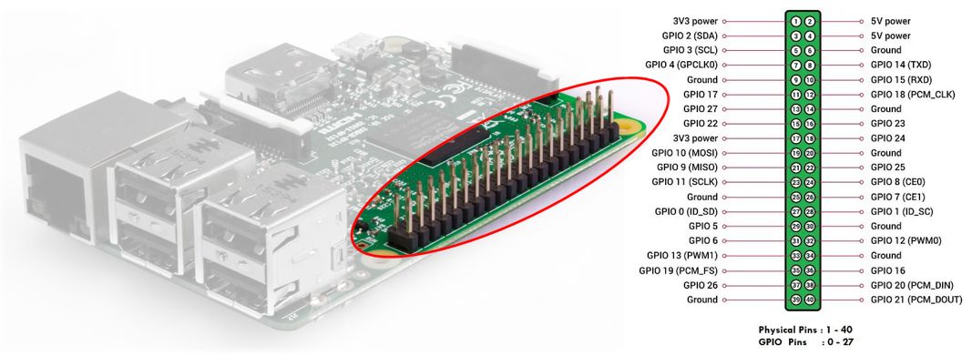 On the side opposite the display ports, the Raspberry Pi features a 40-pin header. Of these, 27 pins serve as general-purpose input/output (GPIO) pins, which can be configured for various functions, including serial communication.